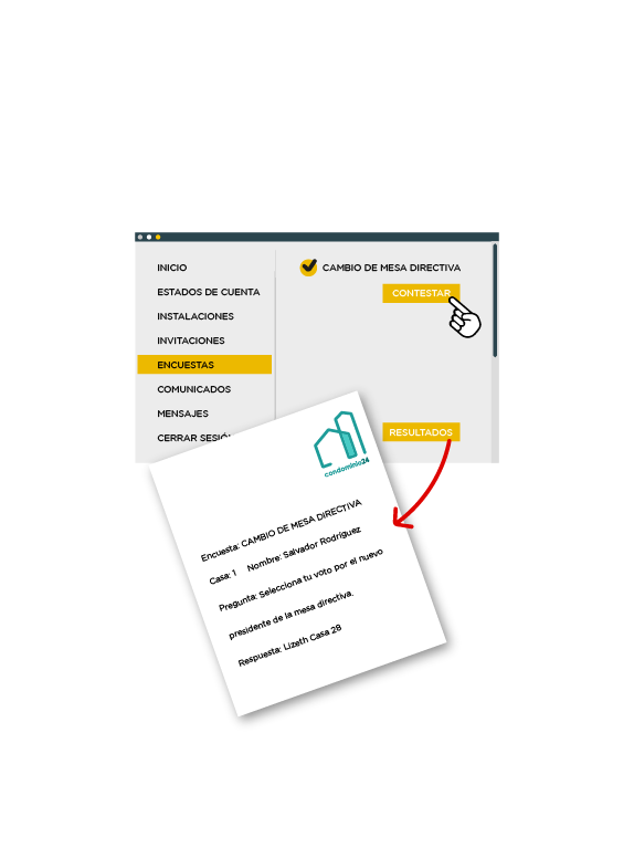 Crea una encuesta y habilita para que tus condóminos respondan. Al finalizar podrás consultar que casas votaron y sus resultados.